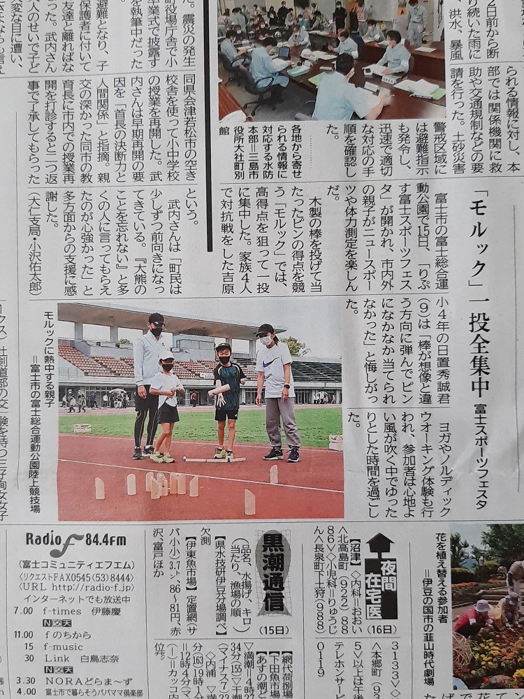 ※ 一番運動量の少ない「モルック」が母子グループに大人気でした。こういうのも今後のヒントになります。 新聞記事にもなりました。